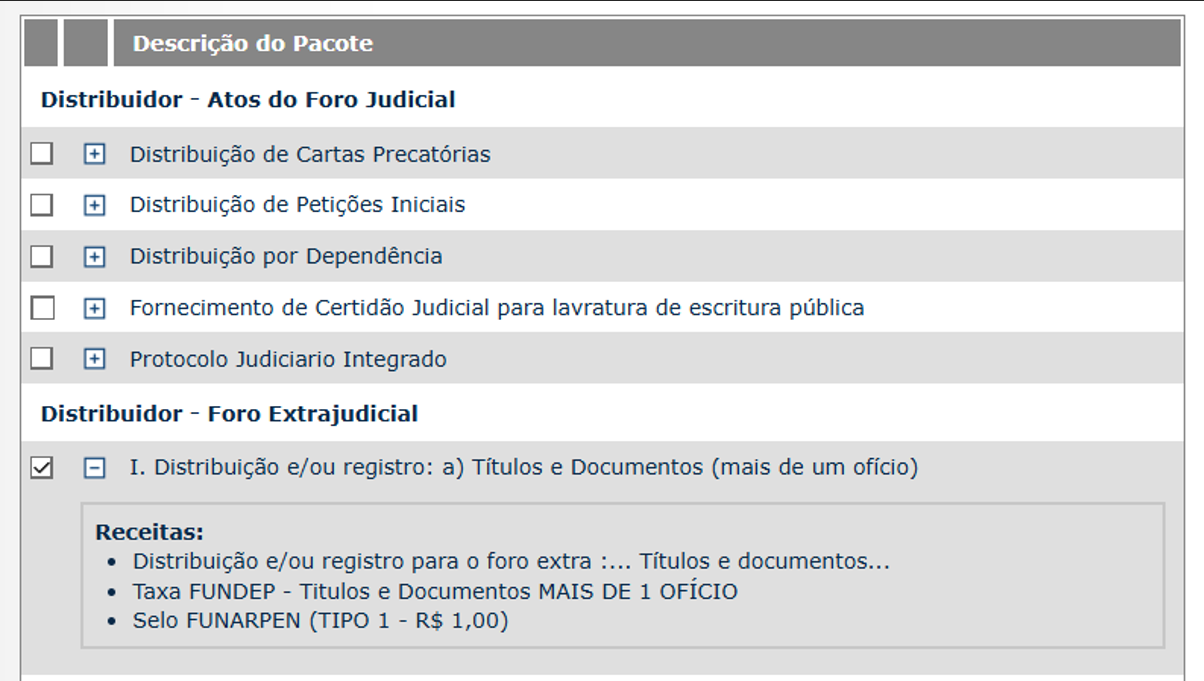 Selecione a seguinte opção “Distribuidor – Foro Extrajudicial”, “I. Distribuição e/ou registro: a) Títulos e Documentos (Mais de um ofício)