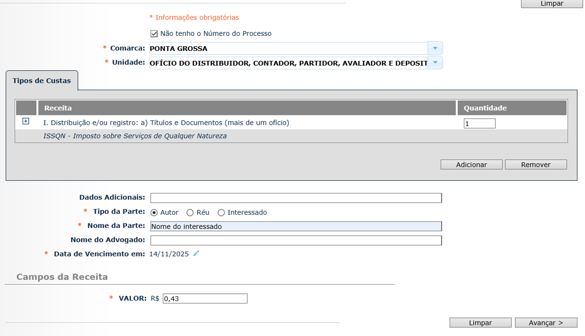 Em comarca você irá selecionar “PONTA GROSSA” e em unidade “OFÍCIO DO DISTRIBUIDOR, CONTADOR, PARTIDOR, AVALIADOR E DEPOSITÁRIO PÚBLICO”